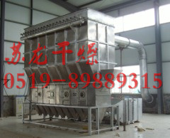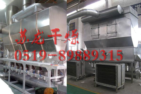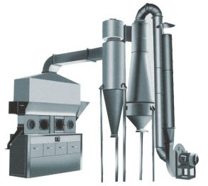 沸腾干燥,又称流化床,它是由空气过滤器、加热器、沸腾床主机、旋风分离器、布袋除尘器、高压离心风机、操作台组成,由于干燥物料的性质不同,配套除尘设备时,可按需要考虑,可同时选择旋风分离器、布袋除尘器,也可选择其中一种,一般来说比重较大的如冲剂及颗粒物料干燥只需选择旋风分离器,比重较轻的小颗粒状和粉状物料需配套布袋除尘器,并备有气力送料装置及皮带输送机供选择。散粒状固体物料由加料器加入流化床干燥器中,过滤后的洁净空气加热后由鼓风机送入流化床底部经分布板与固体物料接触,形成流态化达到气固的热质交换。物料干燥后由排料口排出,废气由沸腾床顶部排出经旋风除尘器组和布袋除尘器回收固体粉料后排空。
