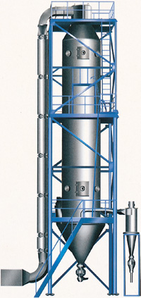 压力式喷雾干燥造粒机是采用压力式雾化器借助隔膜泵的压力将溶液或浆状的物料雾化成细微液滴,使表面积显著增大,经与热风进行充分热交换得以快速干燥(十几秒至几十秒),从而得到粉体或细小颗粒产品的设备。特点: