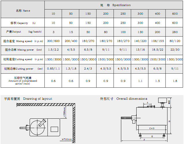 粉体物料与粘合剂在圆筒形容器中由底部混合桨充分混合成湿润软材,然后由侧置的高速粉碎桨切割成均匀的湿颗粒。技术参数: